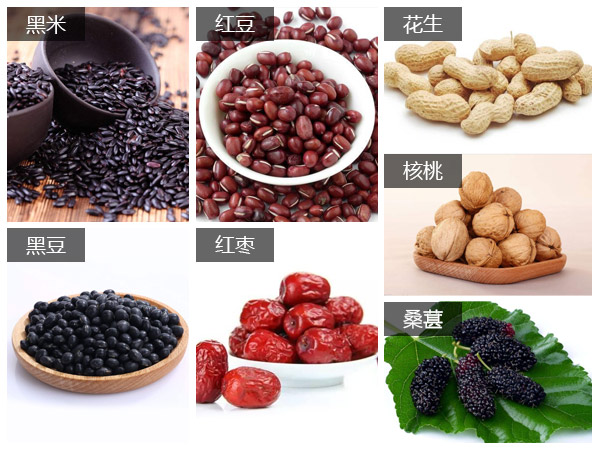 如:黑豆、黑米、黑芝麻、赤小豆、花生、核桃、桑葚、红枣、枸杞等。